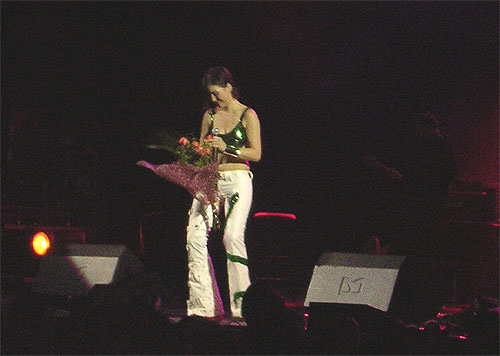 Гаснет свет. Не смолкают крики из зала. И в образе Турмалины, так же как и на обложке своего диска с Красными Крыльями, выбегает Наталия. Передавать состояние присутствующих на концерте просто бесполезно - абсолютная эйфория. Веселые и дождавшиеся фанатки и поклонники в один голос повторяли "Наташа! Наташа! Наташа…". И совершенно на русском в ответ из динамиков "Добрый День! Как дела?". Одним словом диалог наладился с самого начала и продолжался на протяжении всего шоу посредством плюшевых игрушек, букетов цветов, открыток и много еще чем. Поражал и Ангелочек, пятеро или шестеро девочек составили на несколько минут дуэт Наталии. Наверное, самой счастливой была Наташа, приехавшая накануне из Архангельска. На глазах обоих во время песни проступили слезы, все это на двух экранах наблюдал весь Кремль. Вот ведь как бывает. Многие купились на интересную задумку музыкантов. К каждой песни следовало, классно аранжированное вступление. Поэтому было не понятно, что за песня будет следующей, на этот момент устанавливалась тишина, и кто-то рядом упорно пытался вспомнить название. Сообразив, тут же подхватывал слова и продолжал петь. Кто бы ни говорил, но на этот раз, на концерт пришли только те, кто действительно ждал Нати. По окончании концерта из КДСа вышли Юрий Николаев, Илья Резник и кое кто из Российского бомонда. Видимо нашим корифеям музыки и людям шоу бизнеса было интересно послушать песни уругвайской певицы и актрисы. Зная о корнях своего ангелочка кто-то принес флаг Уругвая и растянул его во время концерта. Что вызвало не поддельную радость в глазах Нати.